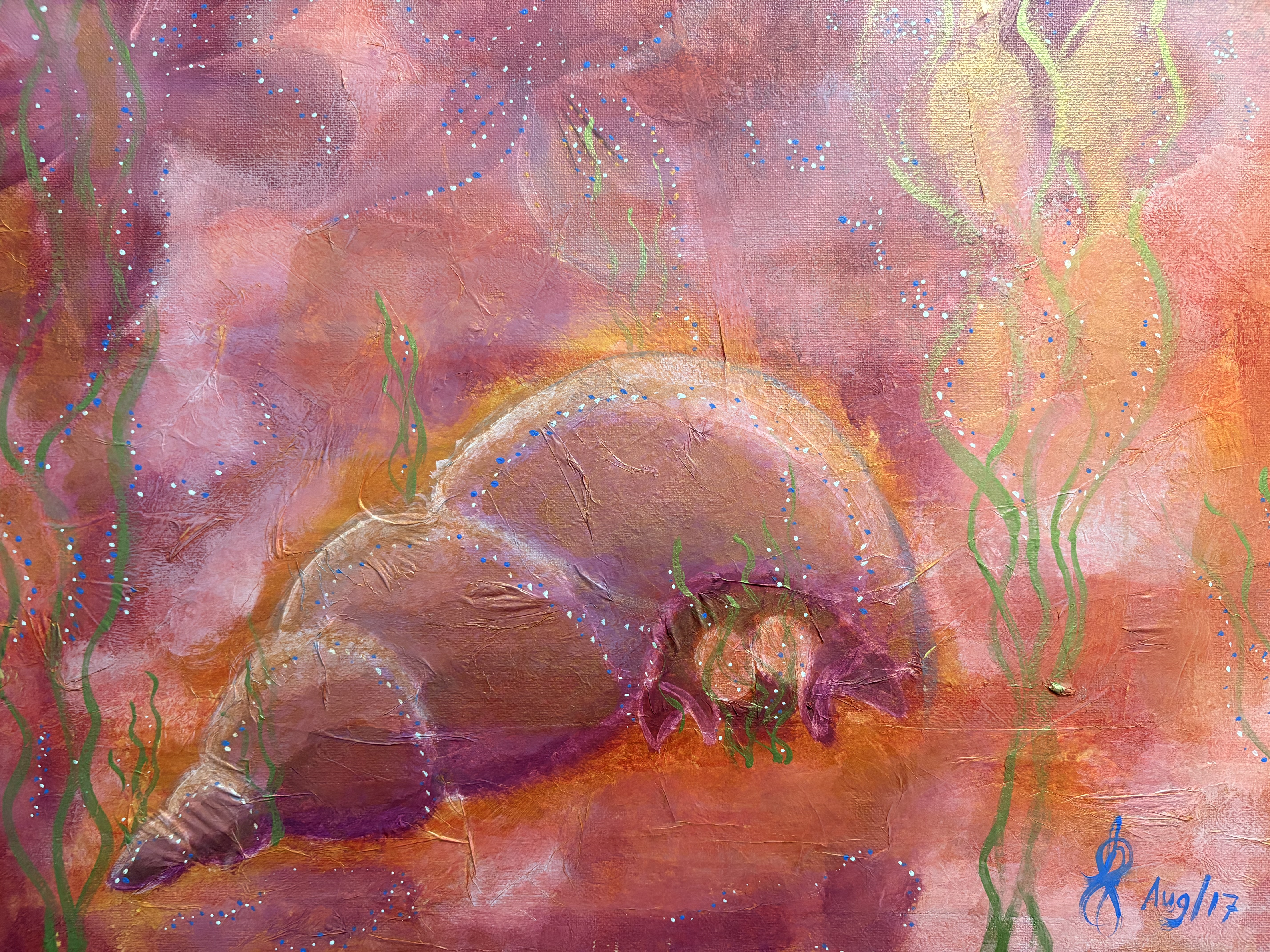 Esta pintura se basa en los colores que emite el cielo en conjunto con los alrededores naturales, en los atardeceres de las costas orientales venezolanas, los cuales se reflejan en la mirada de sus observadores, pero la intención de la obra va mas allá del simple reflejo lumínico, busca resaltar la emoción que se siente al estar en dichos lugares, contemplando el paisaje / This painting draws inspiration from the colors of the sky and the surrounding natural landscape during sunsets along Venezuela's eastern coast, which are reflected in the eyes of those who view it; however, the work's intention goes beyond a mere reflection of light- it seeks to highlight the emotion one feels when standing in those places, gazing at the landscape.