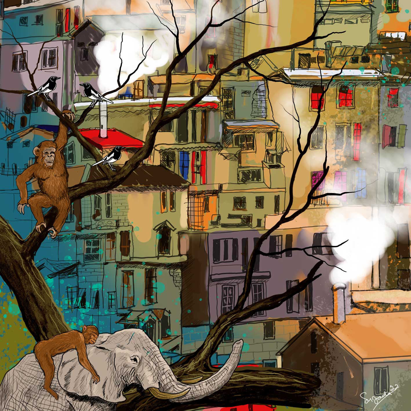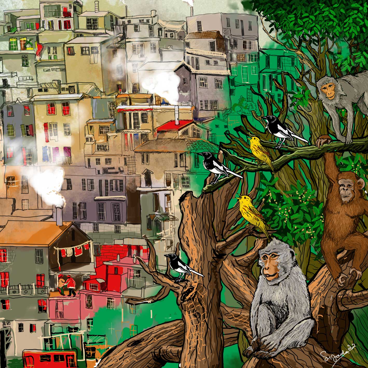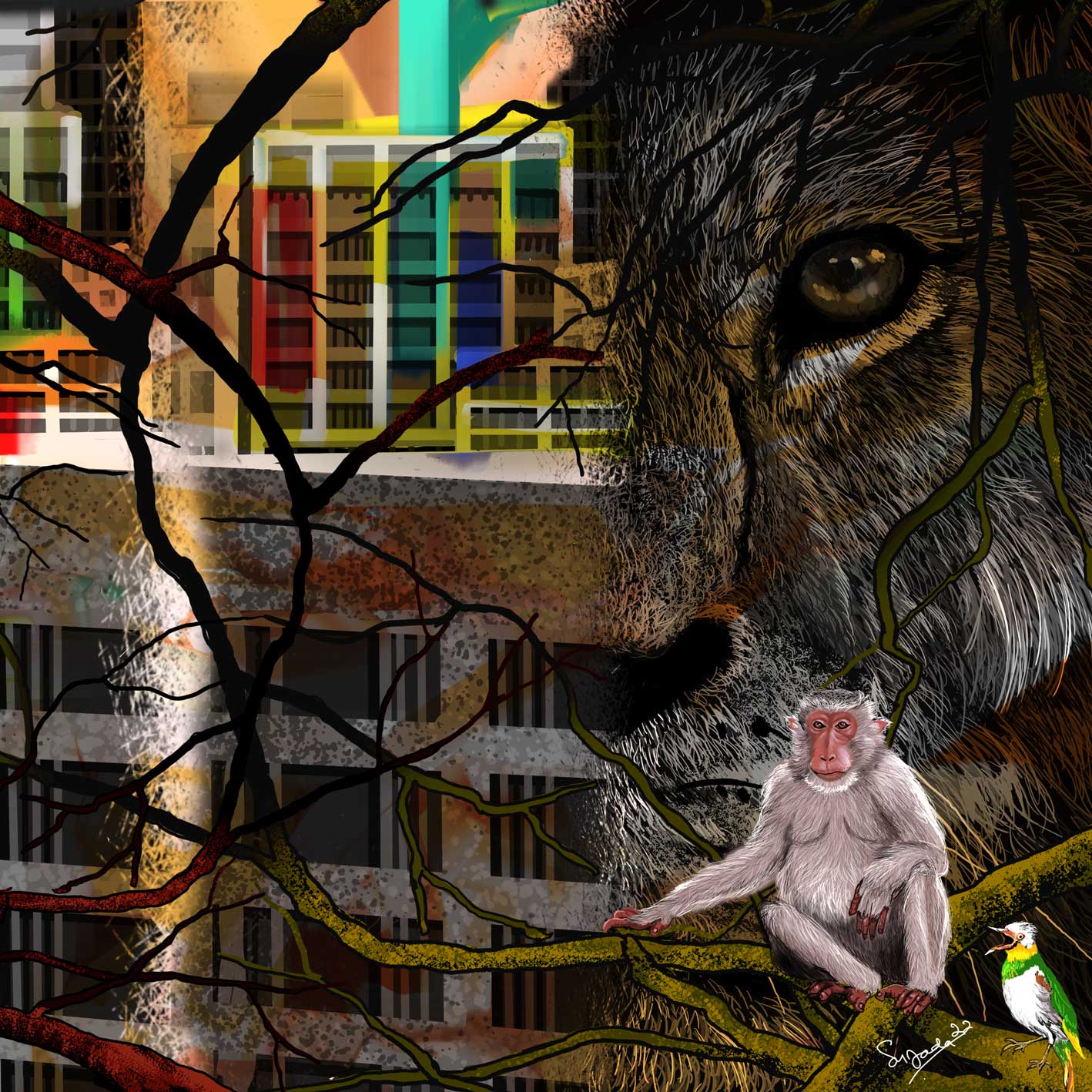 A painting depicting half the face of a lion, an ape and a bird. They were looking at the old multi-storey building that was once the wilderness where they lived. But now it's just a memory because the forest has turned into a multi-storey building.