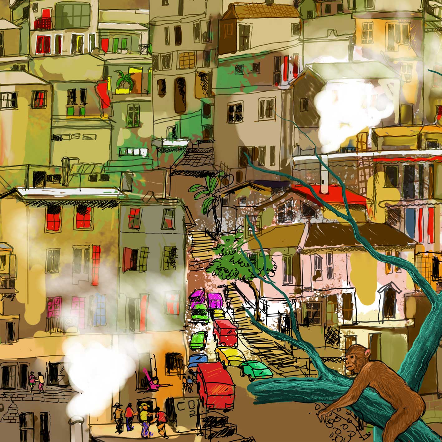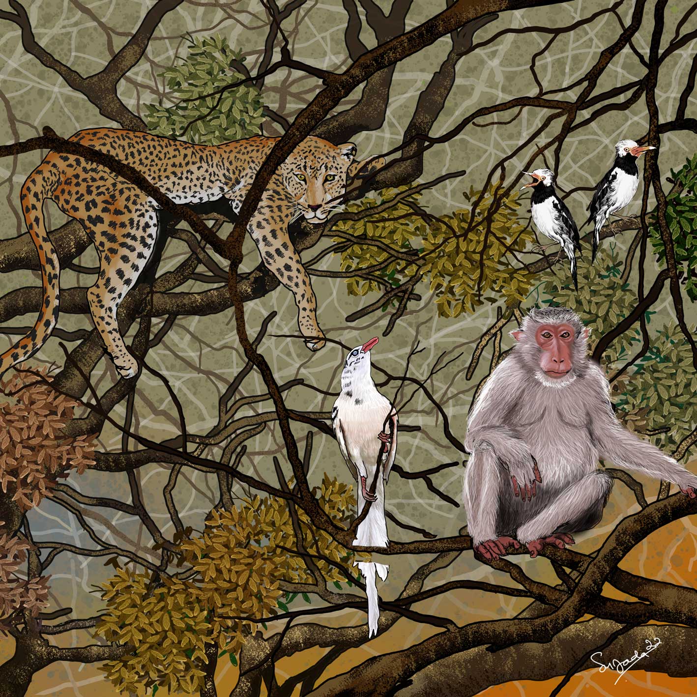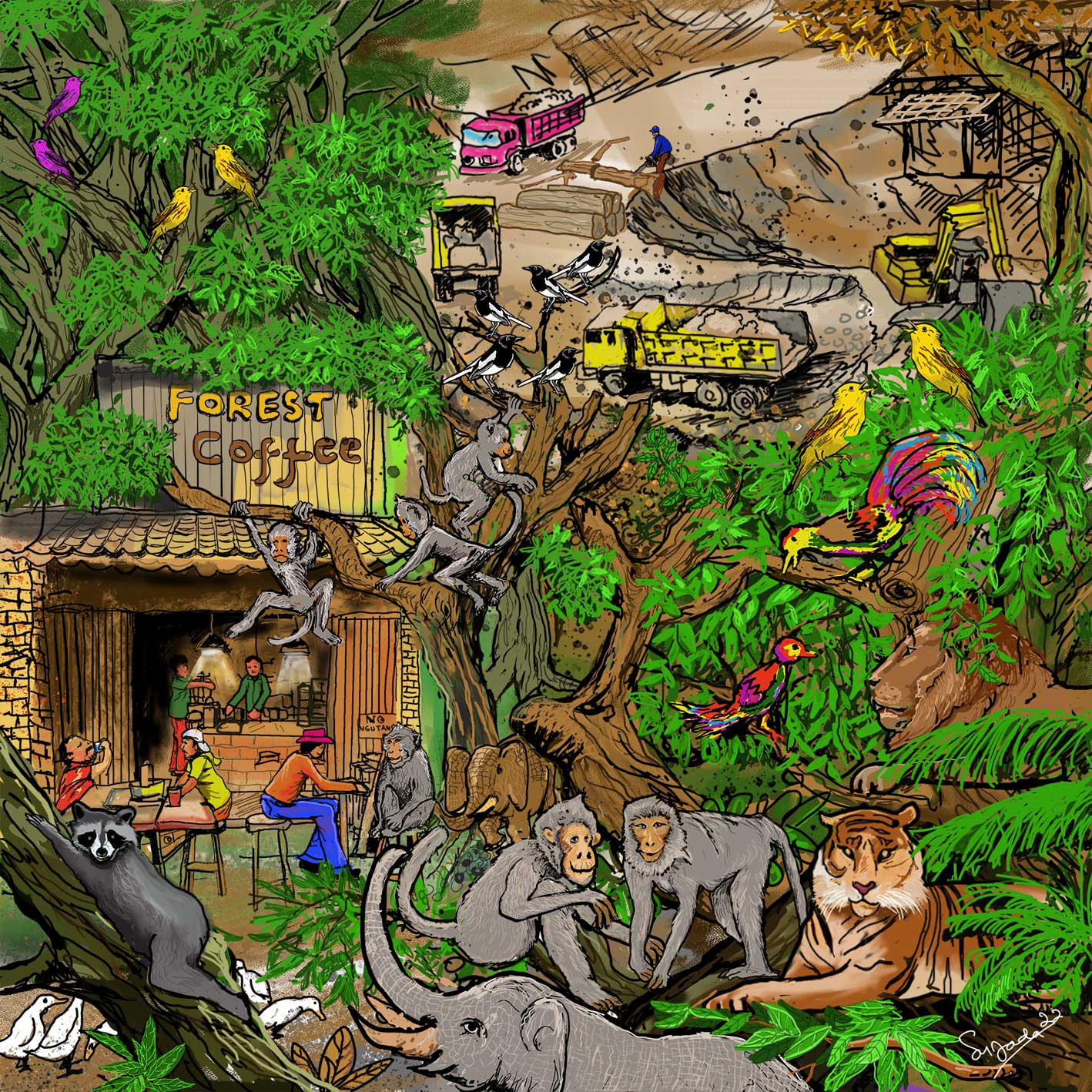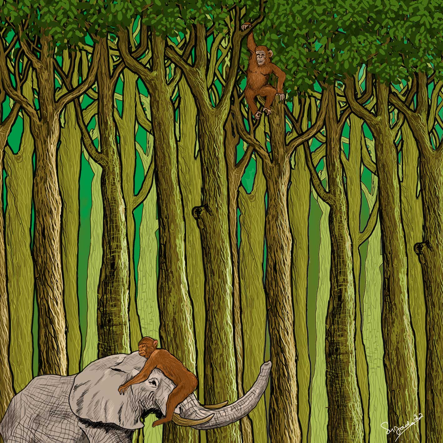 A painting that depicts the friendship between monkeys and elephants. With a large tree background that is cool and comfortable. This happened before their place was cleared by the conglomerates.