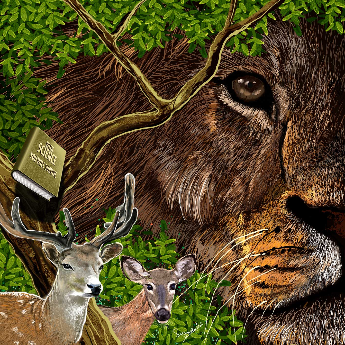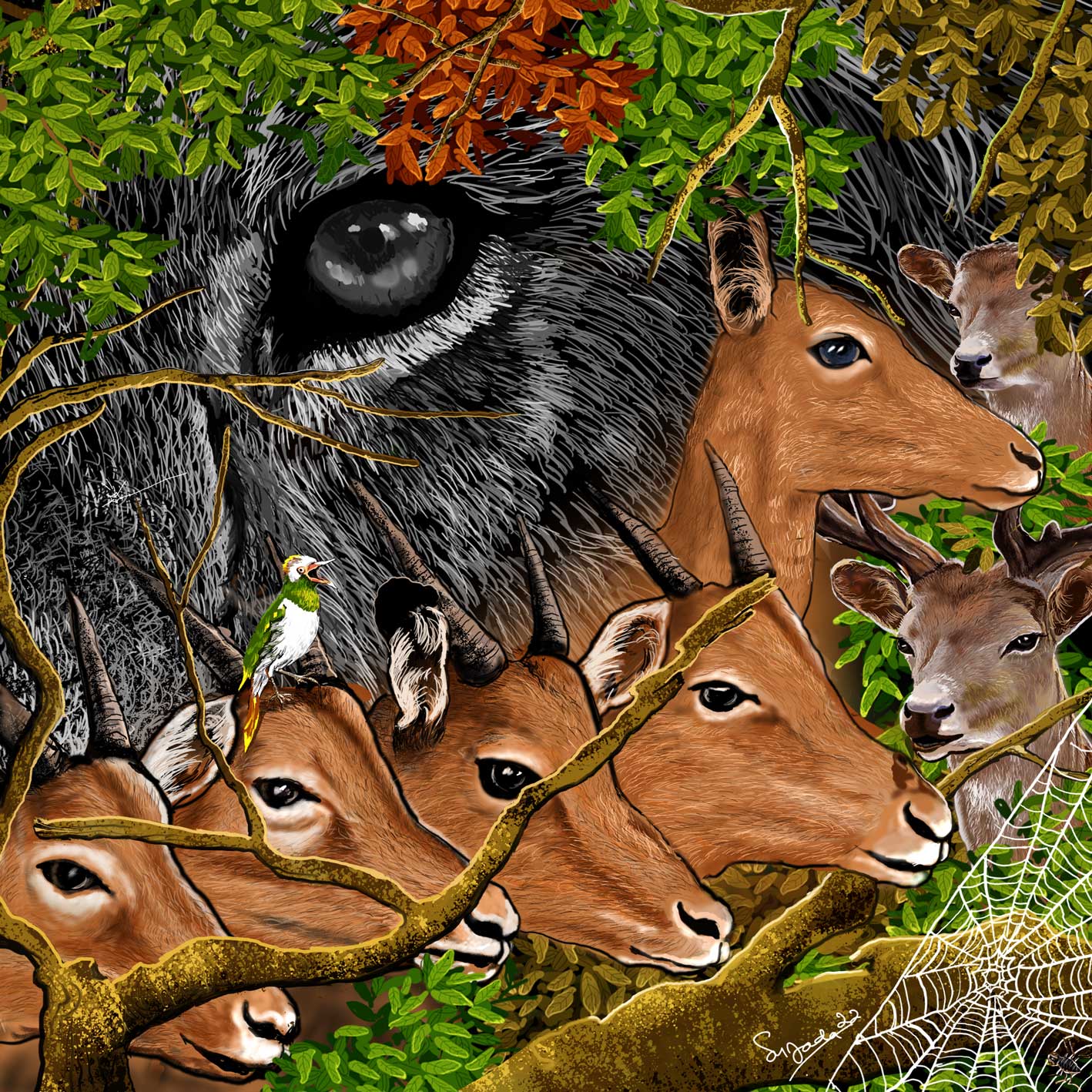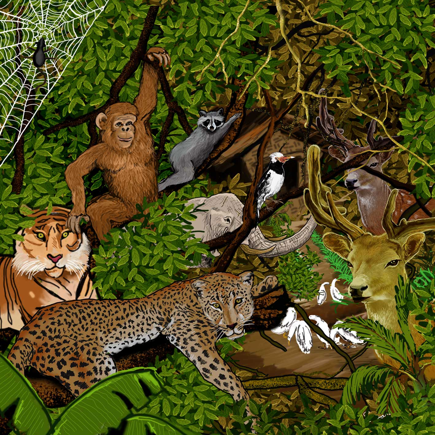 A paintings depicting surviving animals. Forests have been used as human settlements, factories were set up. In the end they could only stare at the building sadly.