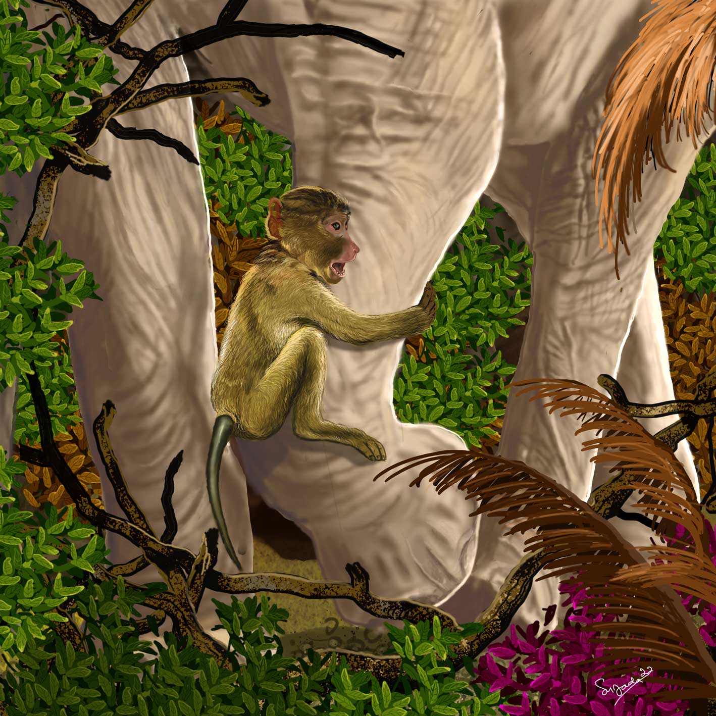 A monkey child who hugs an elephant's leg in search of safety, because the forest is burning. It doesn't matter whose leg is important, it's safe